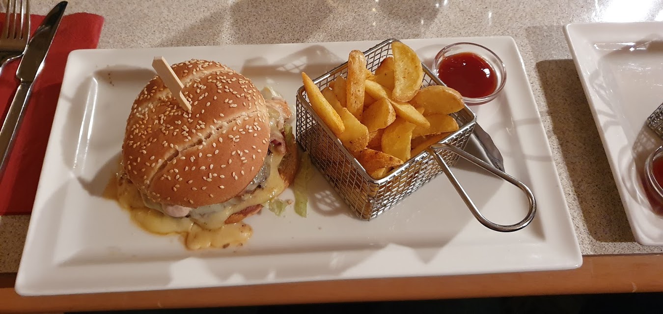 Doch der Hauptgang überzeugte – die Hamburger waren zwar nur noch lauwarm, da sie den Weg über die Strasse gehen mussten, waren aber mit einer Klarsichtfolie vor Witterungs- und sonstigen Einflüssen geschützt.