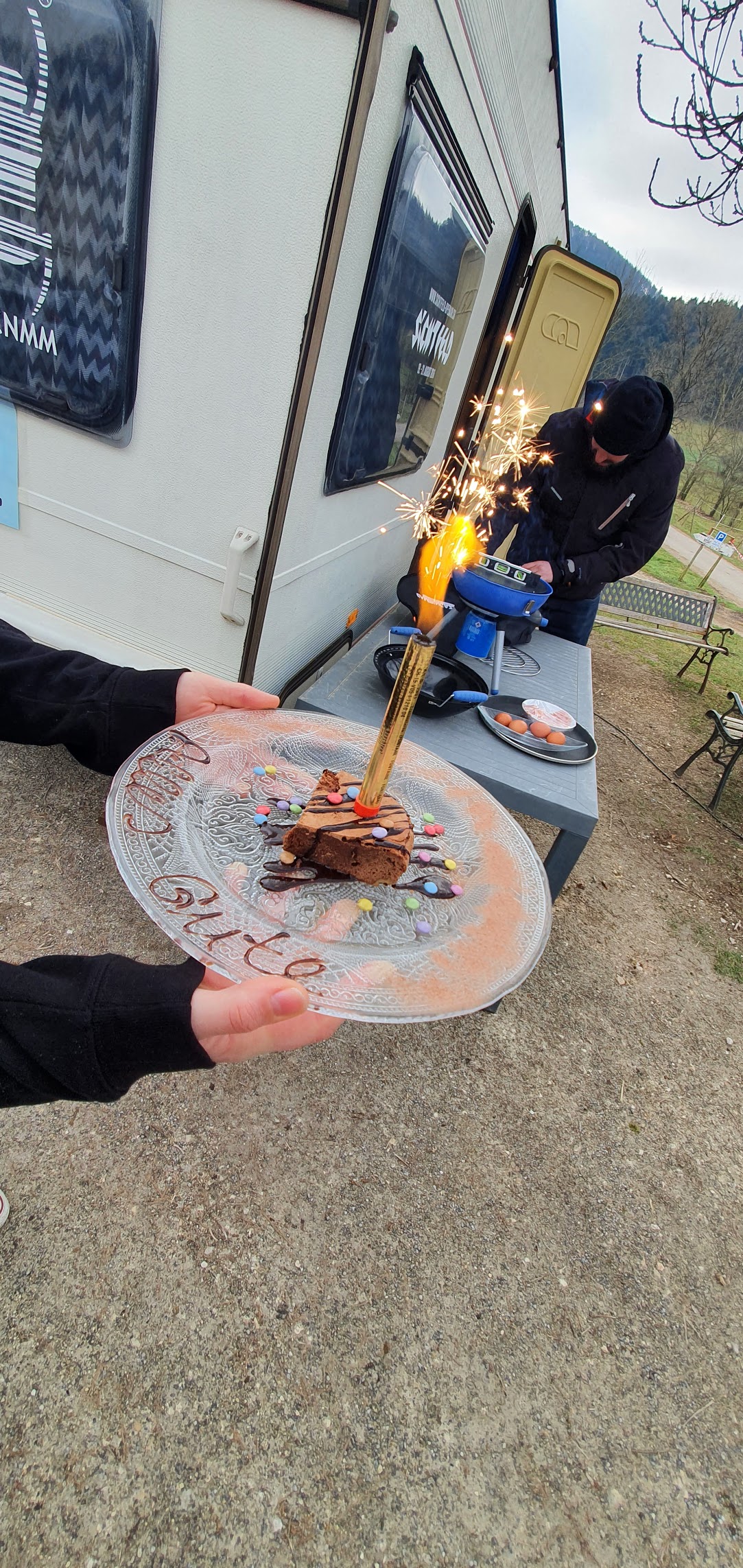 Da wir vorab bei der Pony Ranch noch das Frühstück bestellt hatten, gesellten wir uns dann wieder zu unseren Freunden – sogar der Wohnwagen war dekoriert und ein kleines Geschenk steht bereit (in diesem Sinne nochmals herzlichen Dank für die tolle Überraschung!) – das Geburtstagskind war wirklich überwältigt!