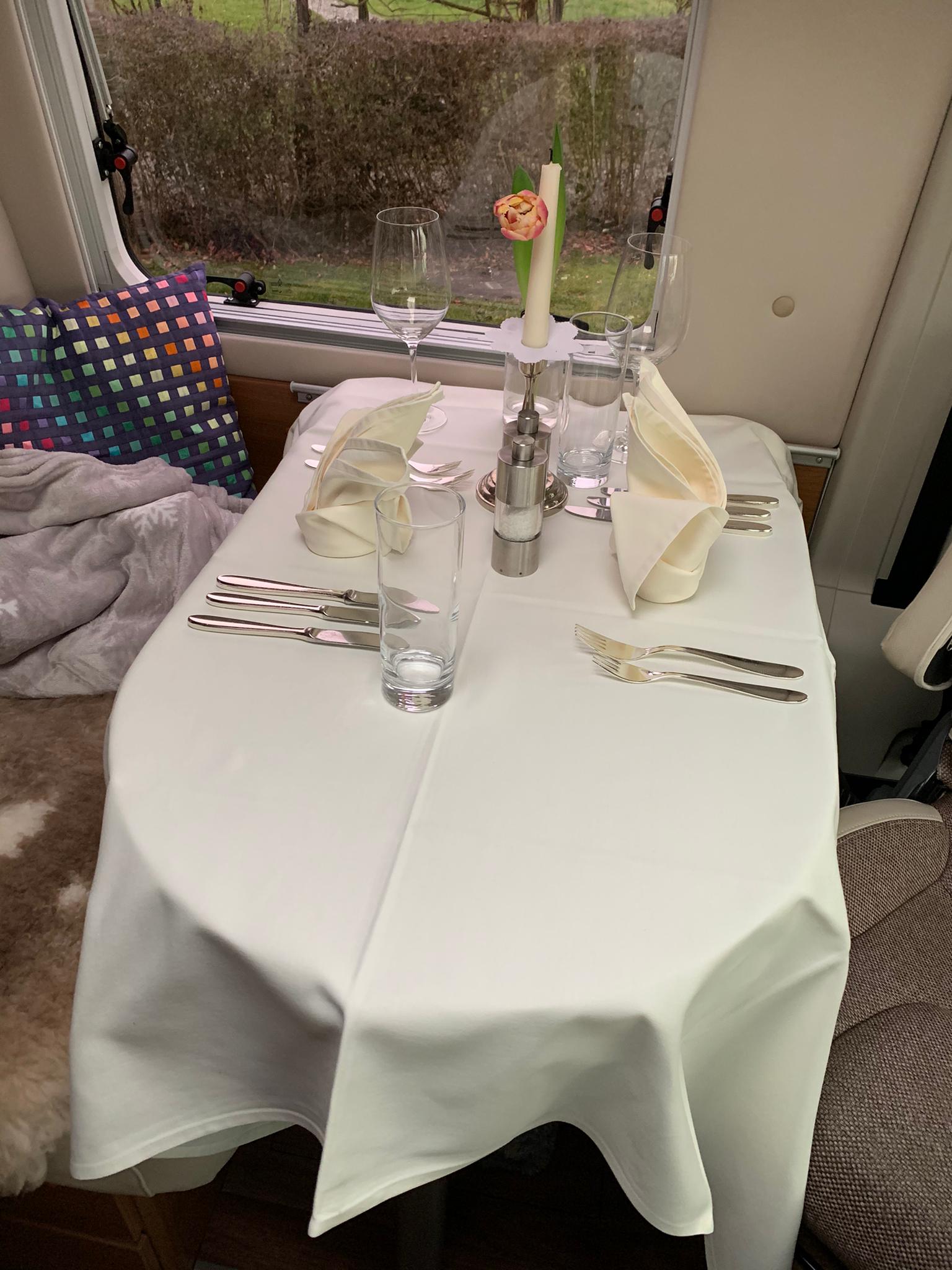 Man wird von der Gastgeberin Frau Eigenmann sehr herzlich begrüsst, erhält eine grüne Faltkiste, wie man sie auch von Gemüselieferanten, oder vom Grossmarkt kennt – darin enthalten ist ein schönes Gedeck, welches im Wohnmobil tatsächlich das Flair eines feinen Dinners im Restaurant verbreitet.